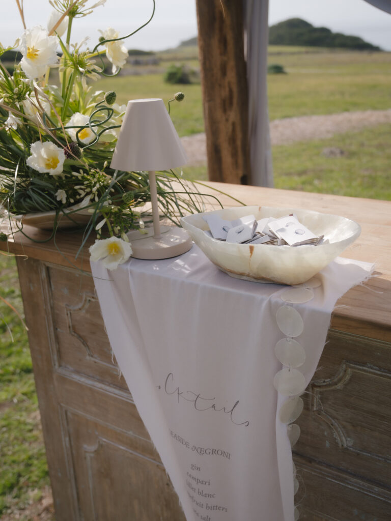 • Decor: Candles in hurricane jars, driftwood signage, hand-dyed fabrics, and elements inspired by the tides