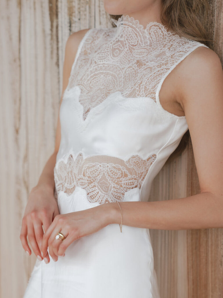 Vintage accents bring a cinematic quality to your coastal chic wedding. So, consider woven textures, glass candleholders, or mismatched seating for your ceremony. We especially loved how our couple J+M thrifted her ceremony dress and french lace wedding veil for romantic texture.