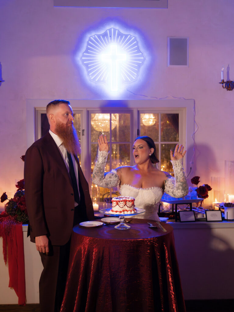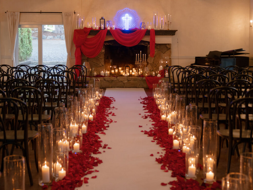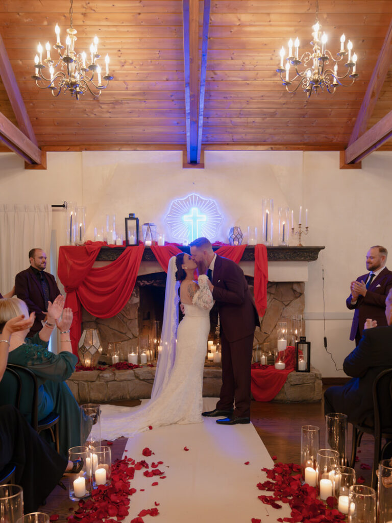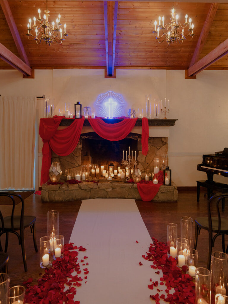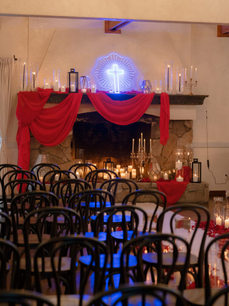 Dozens of candles lined the aisle with red drapery and crystal decor were placed romantically on the large stone fireplace. This ceremony blended seamlessly with their theme. We especially loved the blue neon cross inspired by the 1996 Romeo and Juliet film.