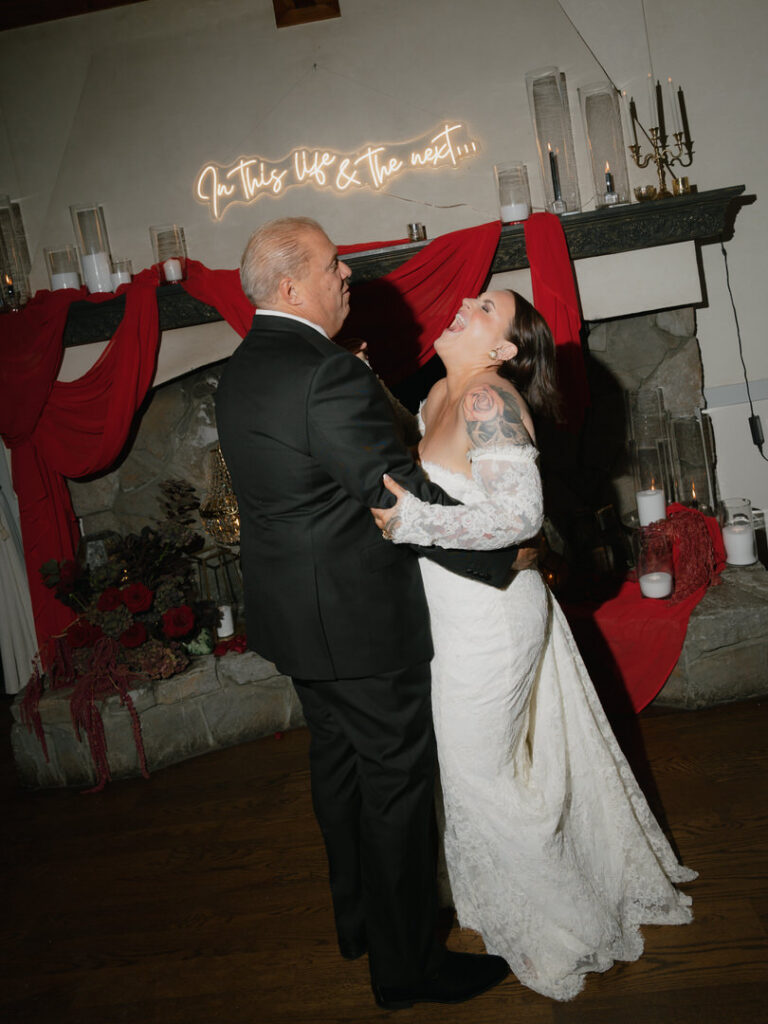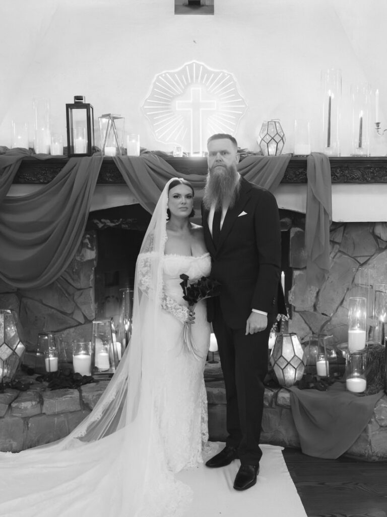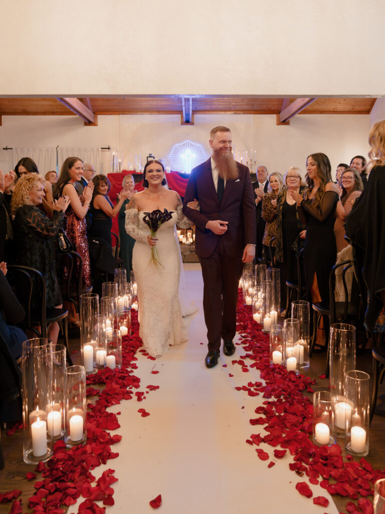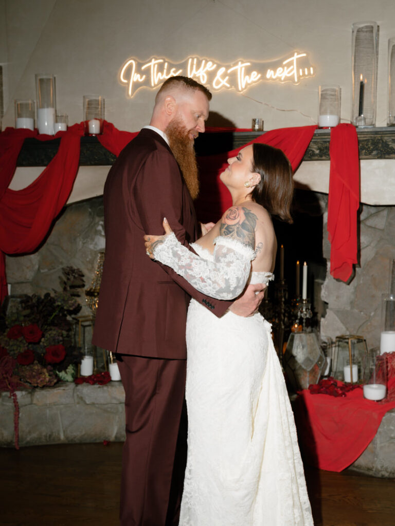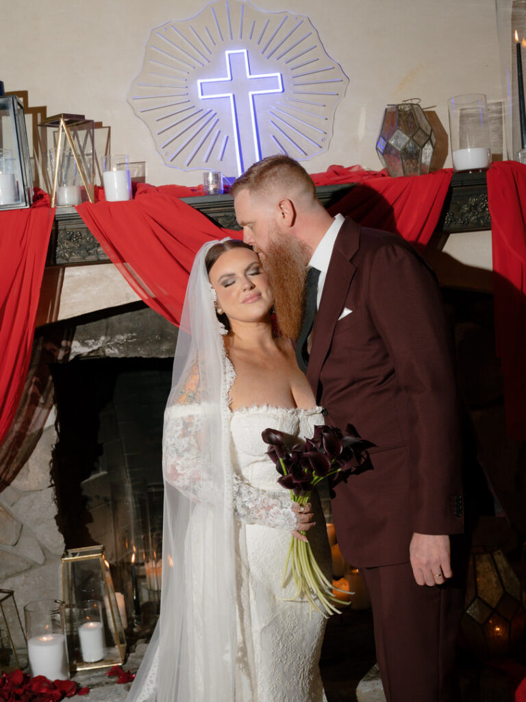 Dozens of candles lined the aisle with red drapery and crystal decor were placed romantically on the large stone fireplace. This ceremony blended seamlessly with their theme. We especially loved the blue neon cross inspired by the 1996 Romeo and Juliet film.