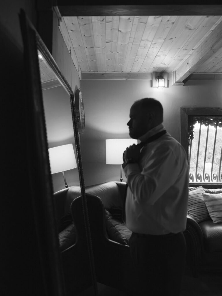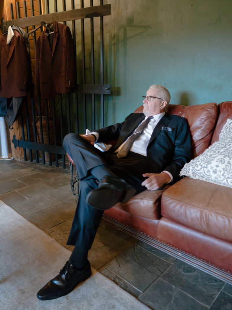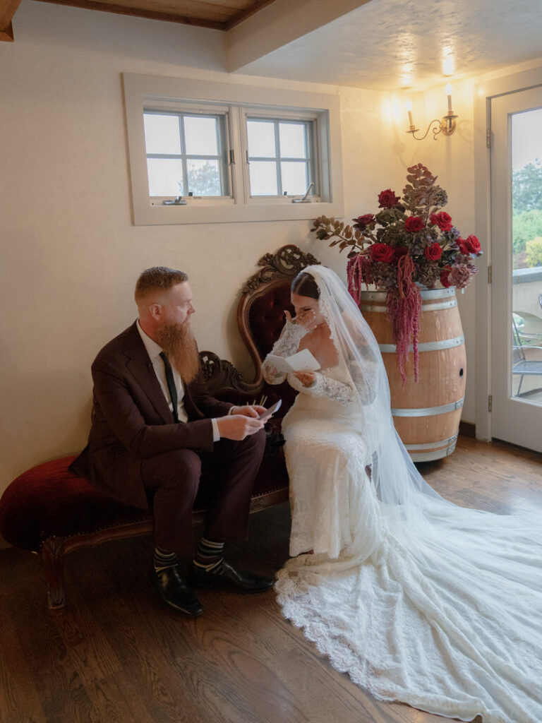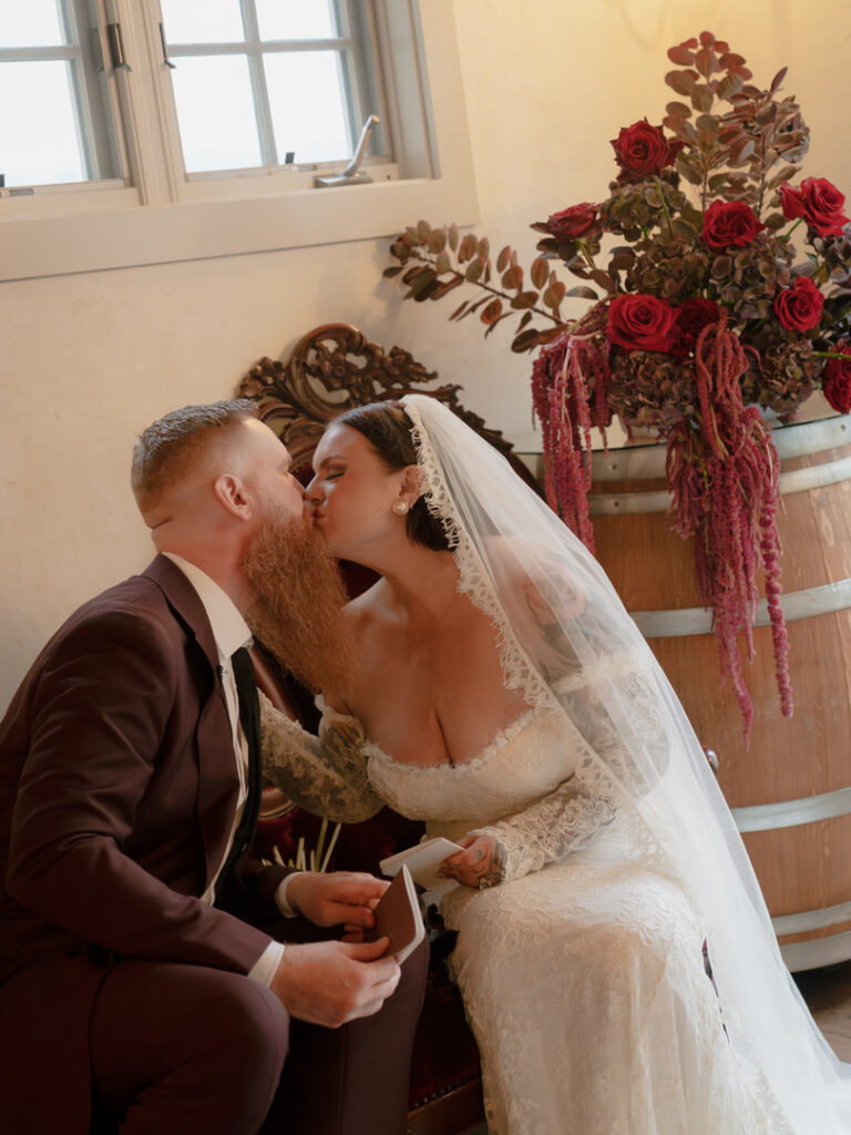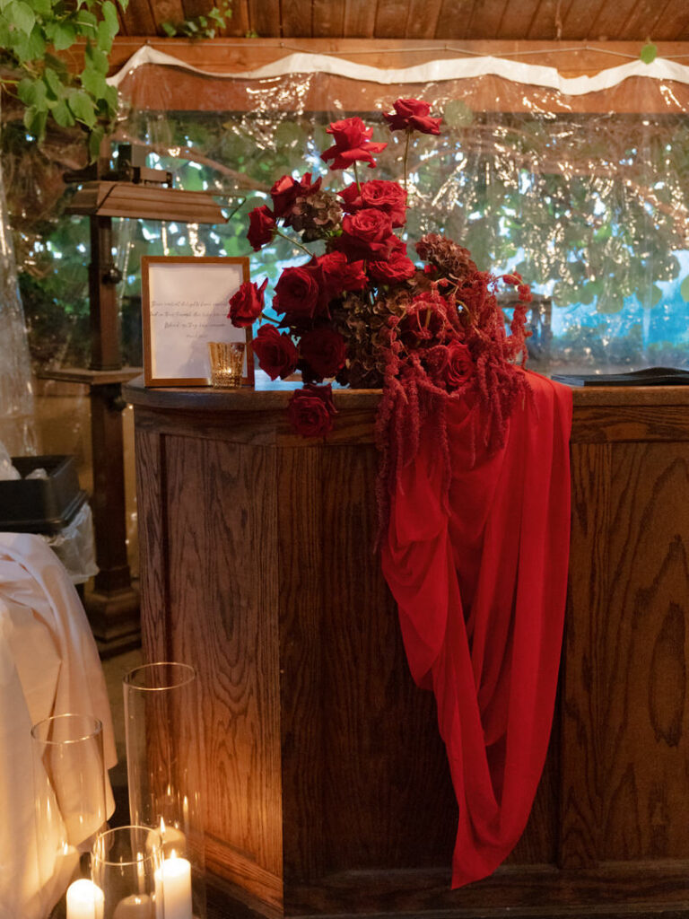 After doing some formal family photos in front of the fireplace, the couple requested to do their vows privately. We decorated this corner with the red couch we used from earlier for their details. Then, we added a floral arrangement on top of a wine barrel for extra decor.