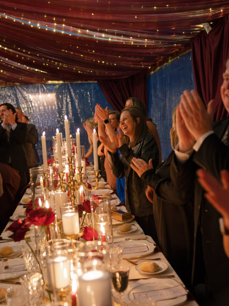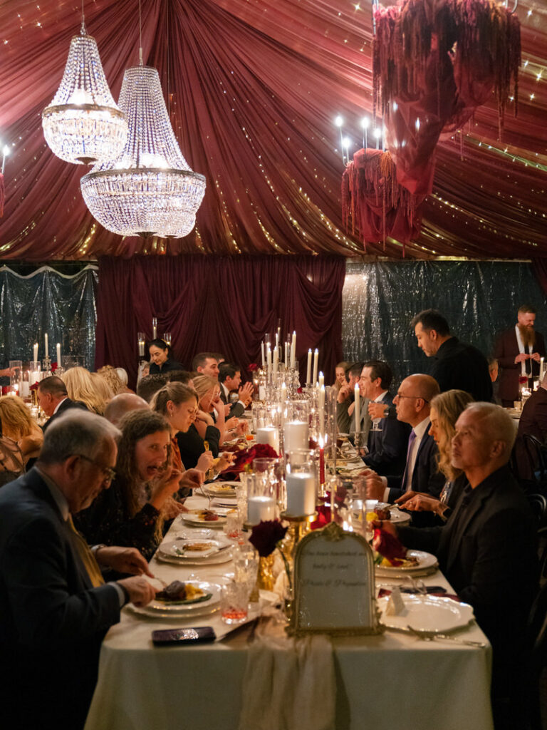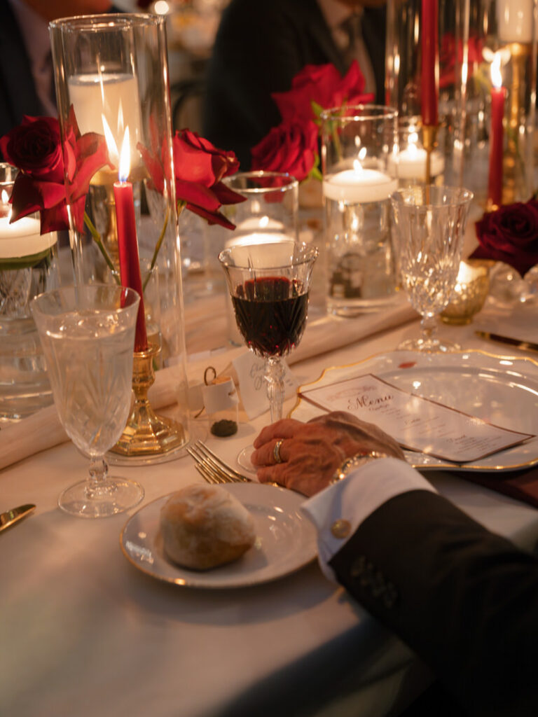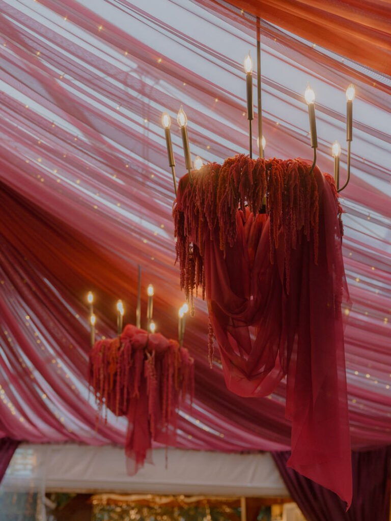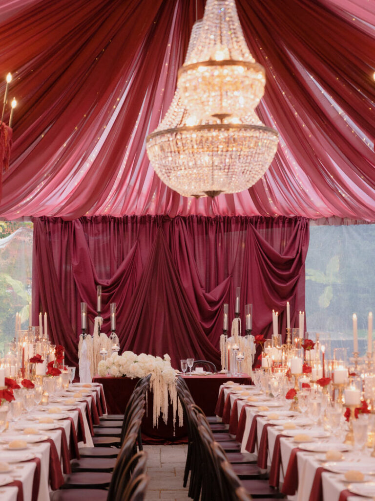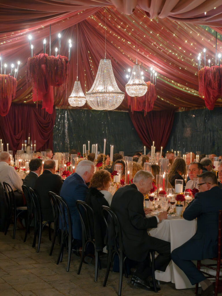 Chateau Lill’s patio area served as a perfect blank slate for Jenna & Chad’s vendor team to completely transform. Red drapery, florals hanging from the chandeliers and hundreds of candles later, they had the most romantic dinner setting.
