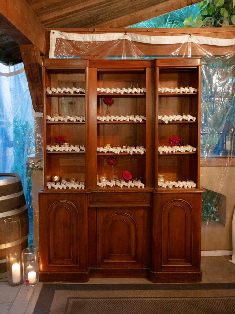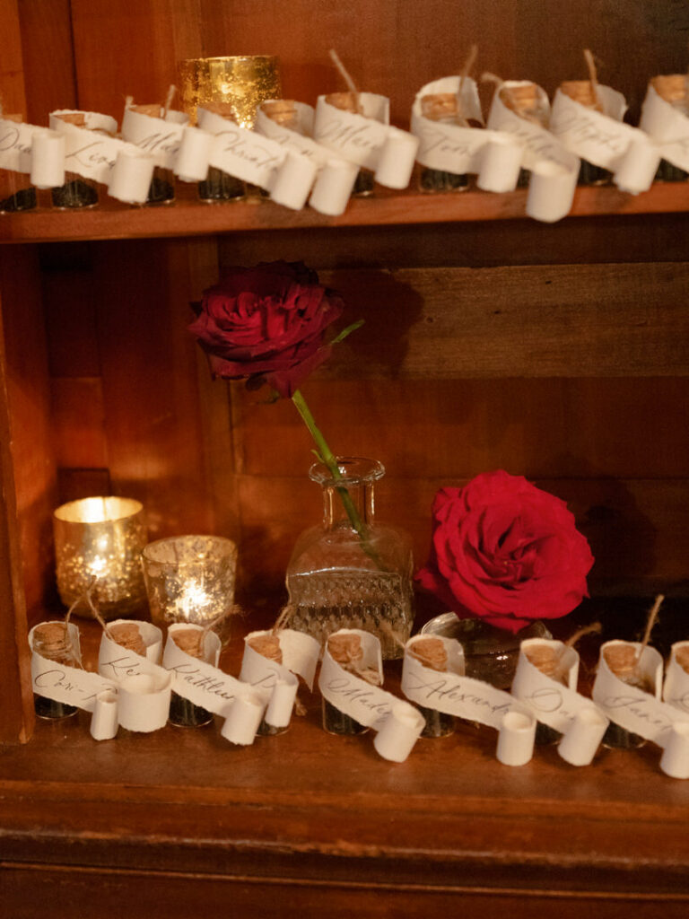 Lastly, the seating chart wall of tea leaves in a bottle or “poison” in a bottle with everyone’s names on it was a hit!